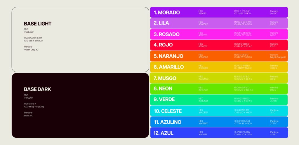 Nuestros colores principales, a los que denominamos base light y base dark, son la esencia de GoodRabbit. Y aunque lo clásico y sobrio son características principales de nuestra marca, también tenemos un poco de locura en los 12 colores que conforman nuestra paleta. Estos colores tienen una forma muy estricta de uso, se deben usar siempre de forma secuencial sin saltarse ninguno.